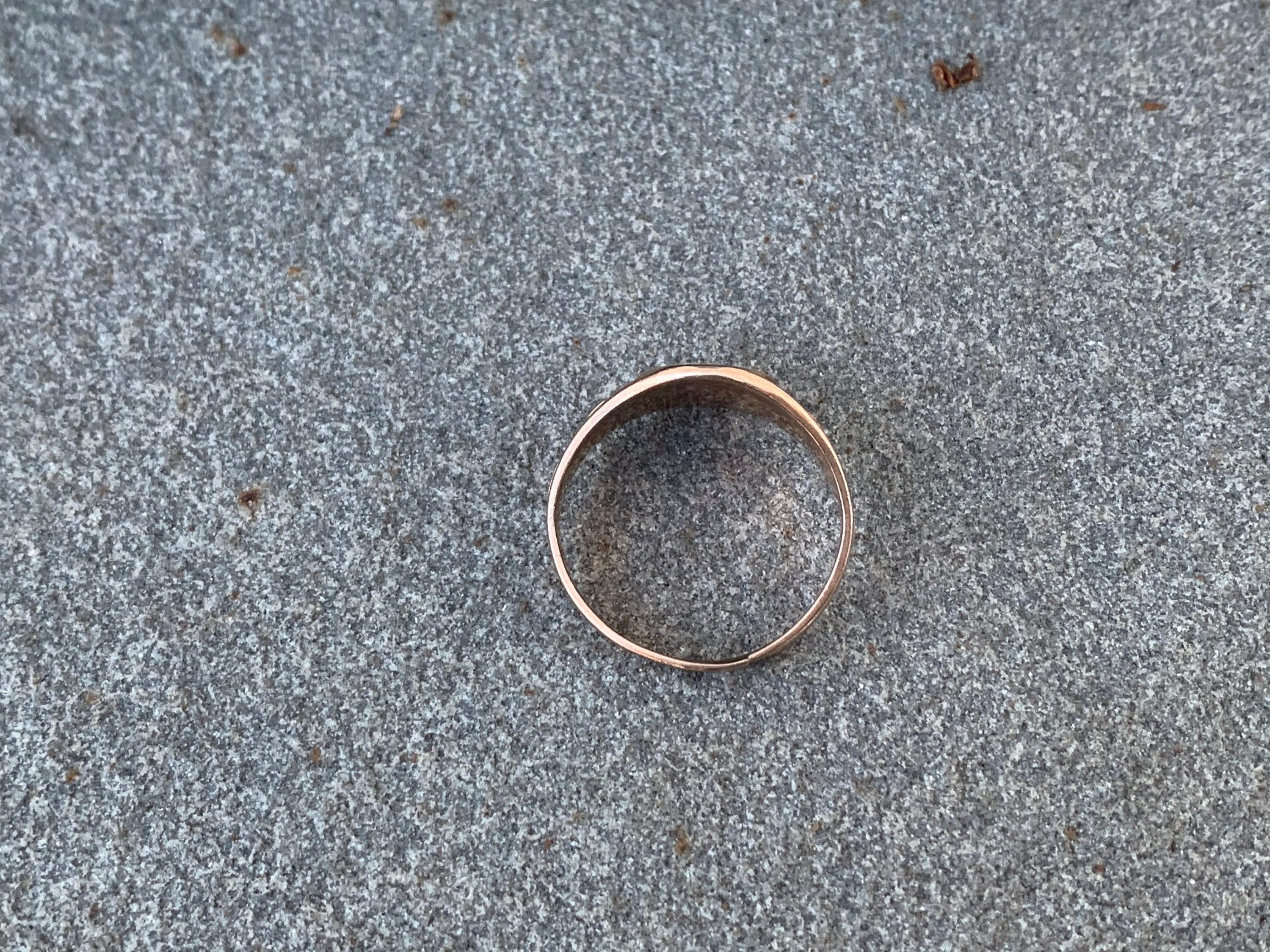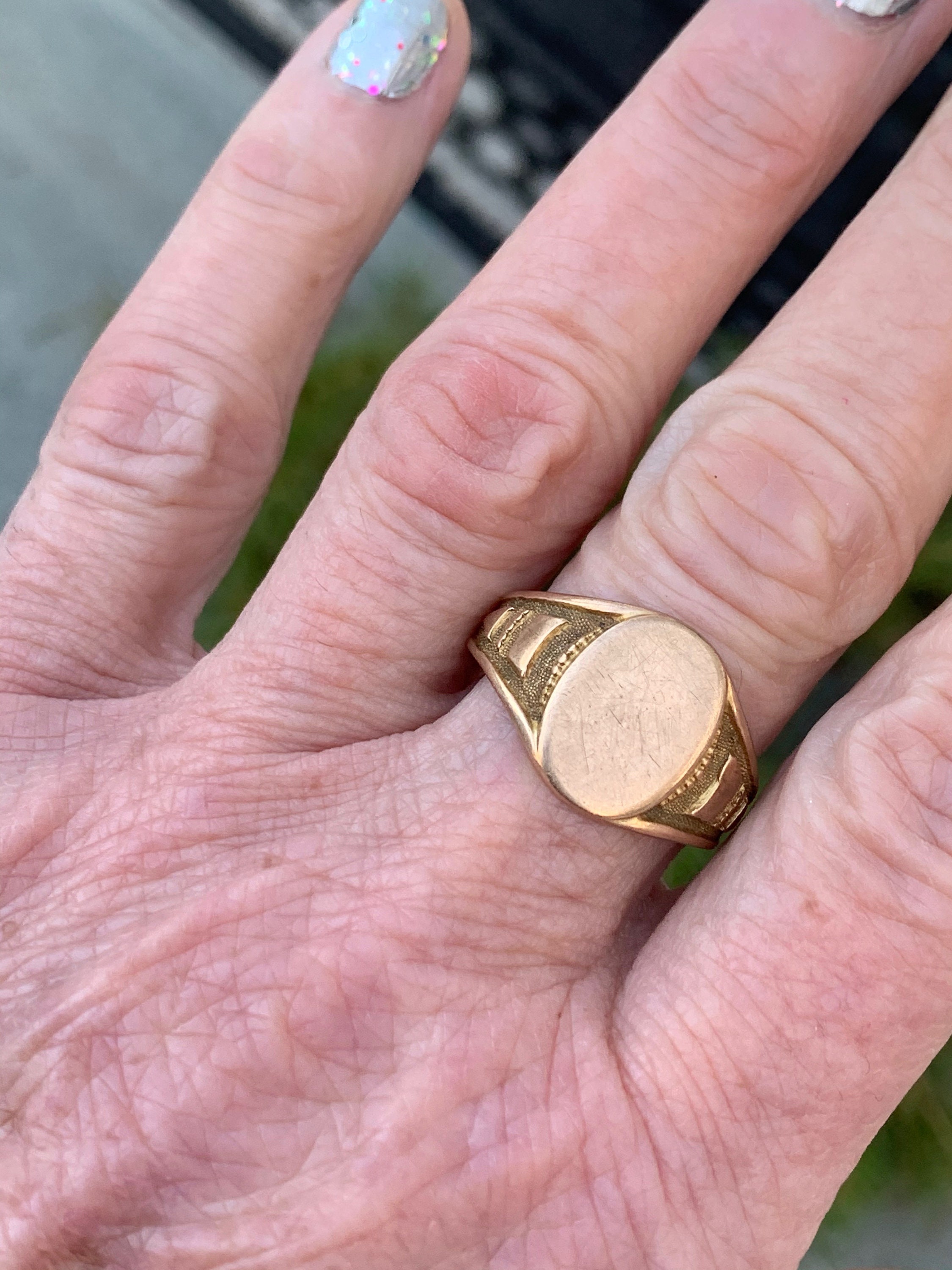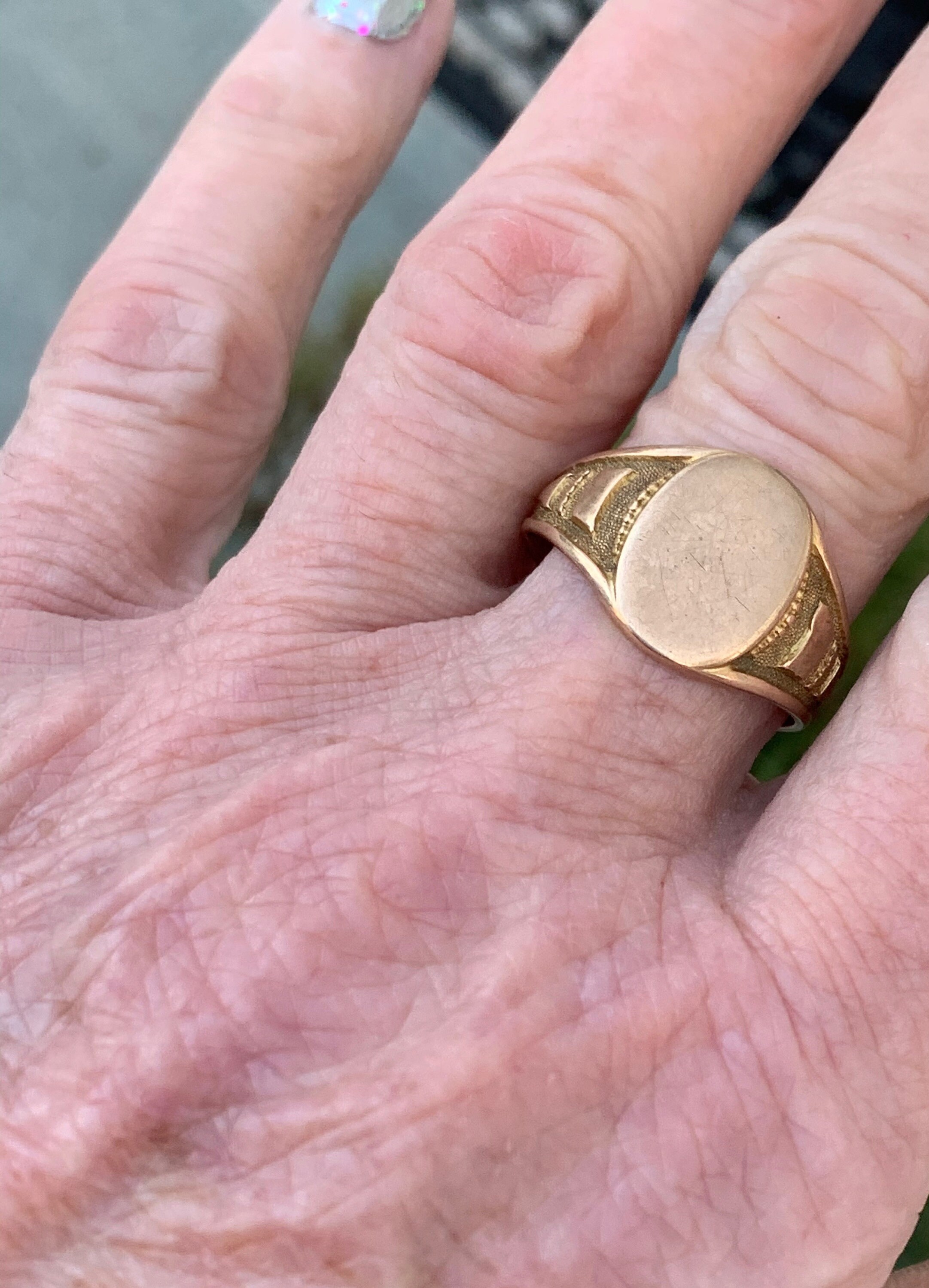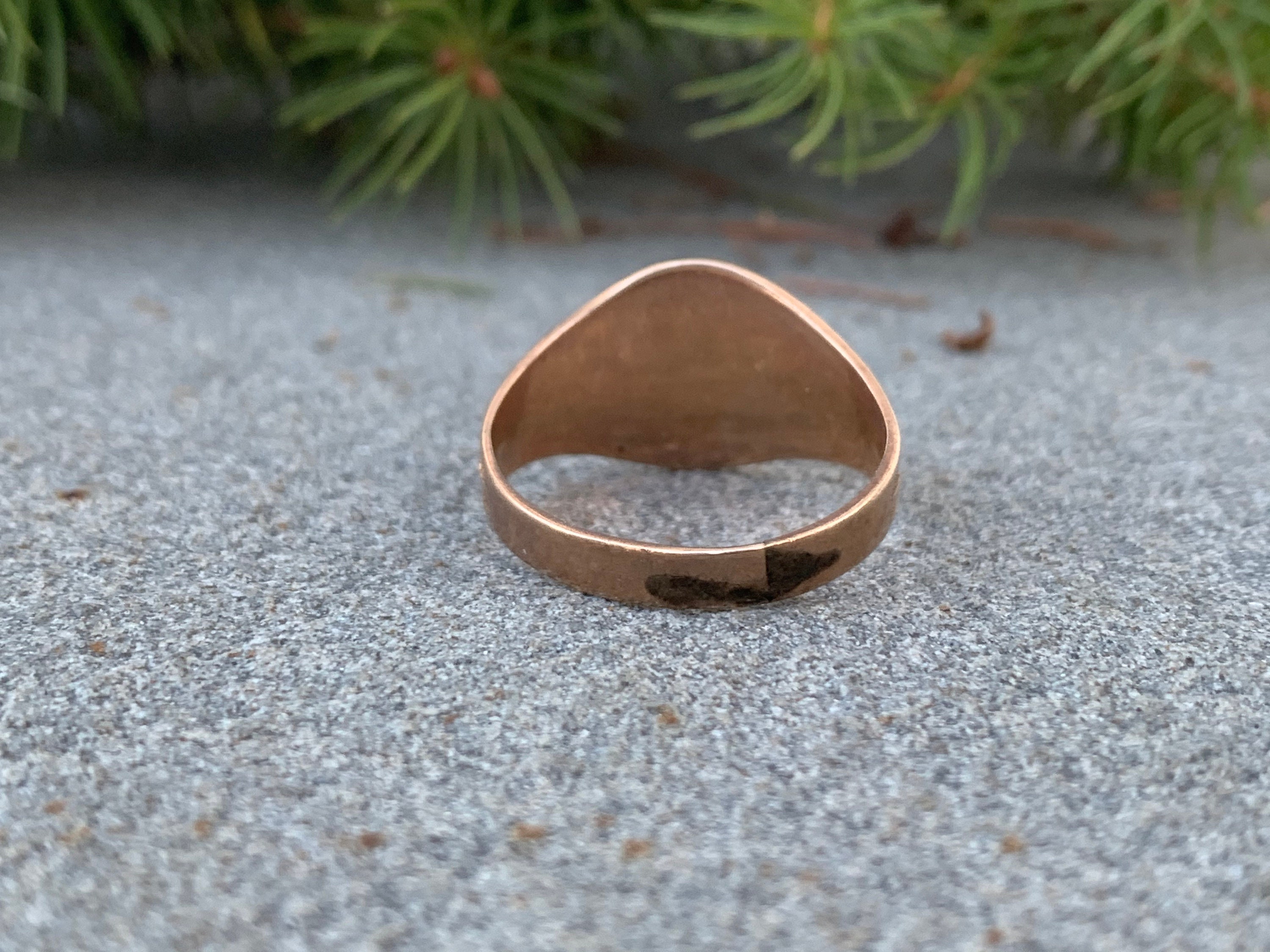 This distinctive Victorian signet ring is set in 10k yellow gold. It dates from the 1800s. The center oval shaped signet creates a quiet powerfulness. The sides are beautifully and boldly scrolled in a lyrical design. Will fit a size 10 finger. It weighs 5.48 grams. The top measures 3/8" x 3/4".