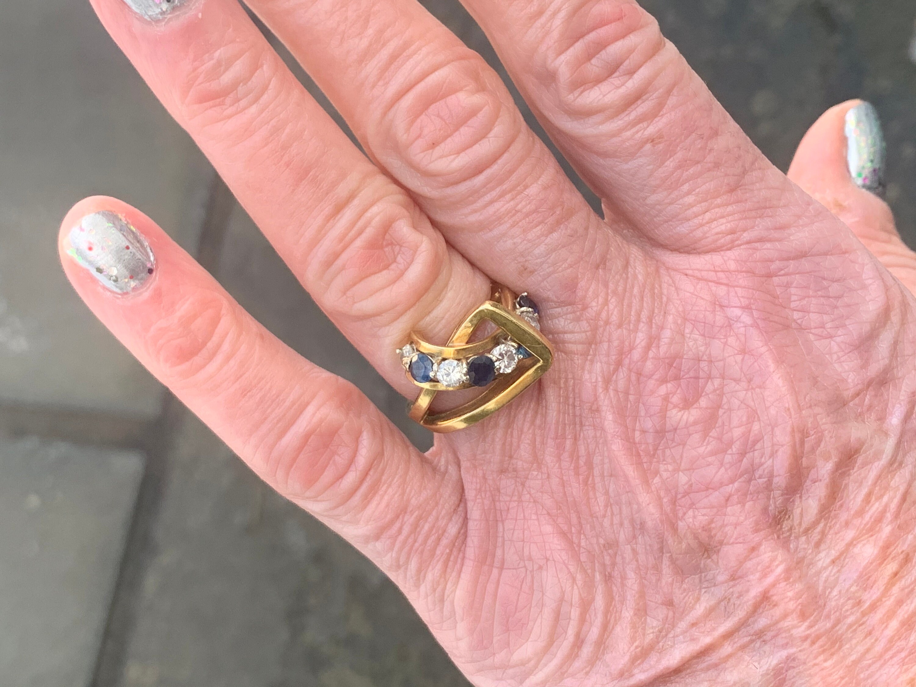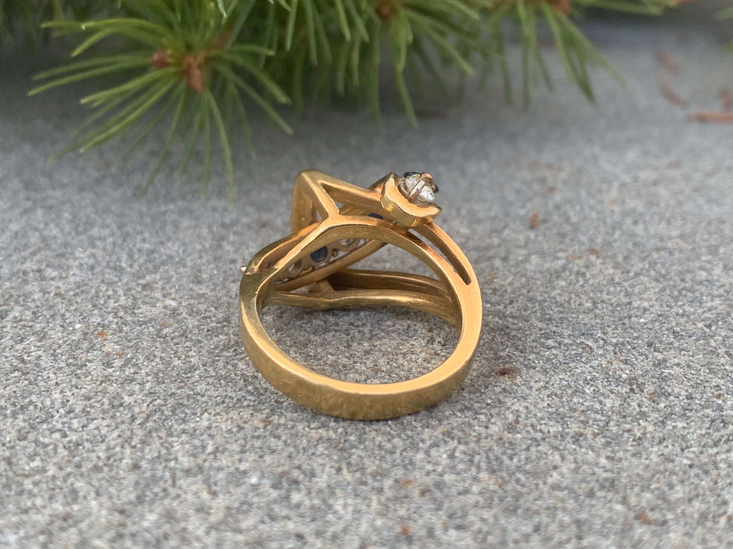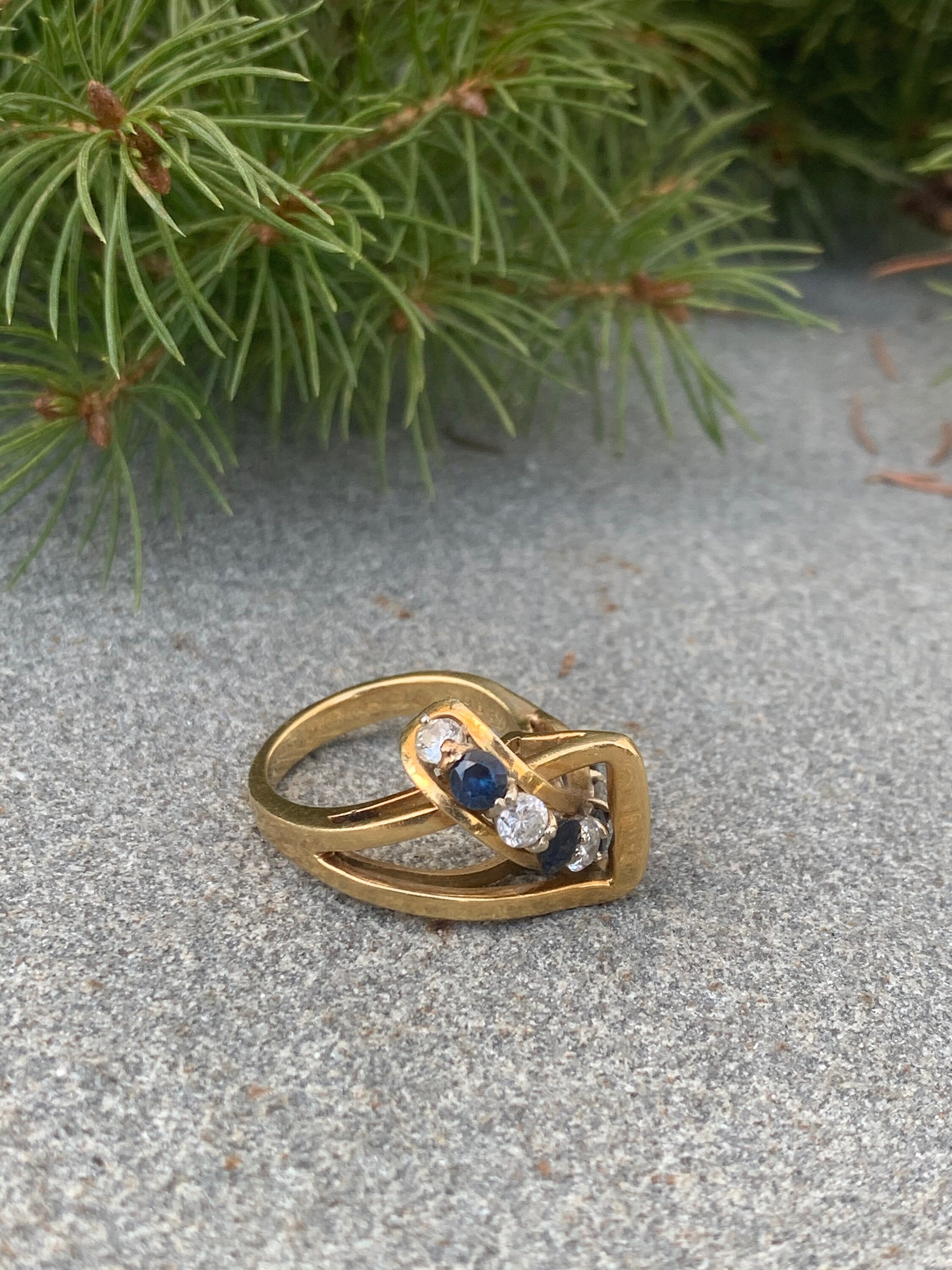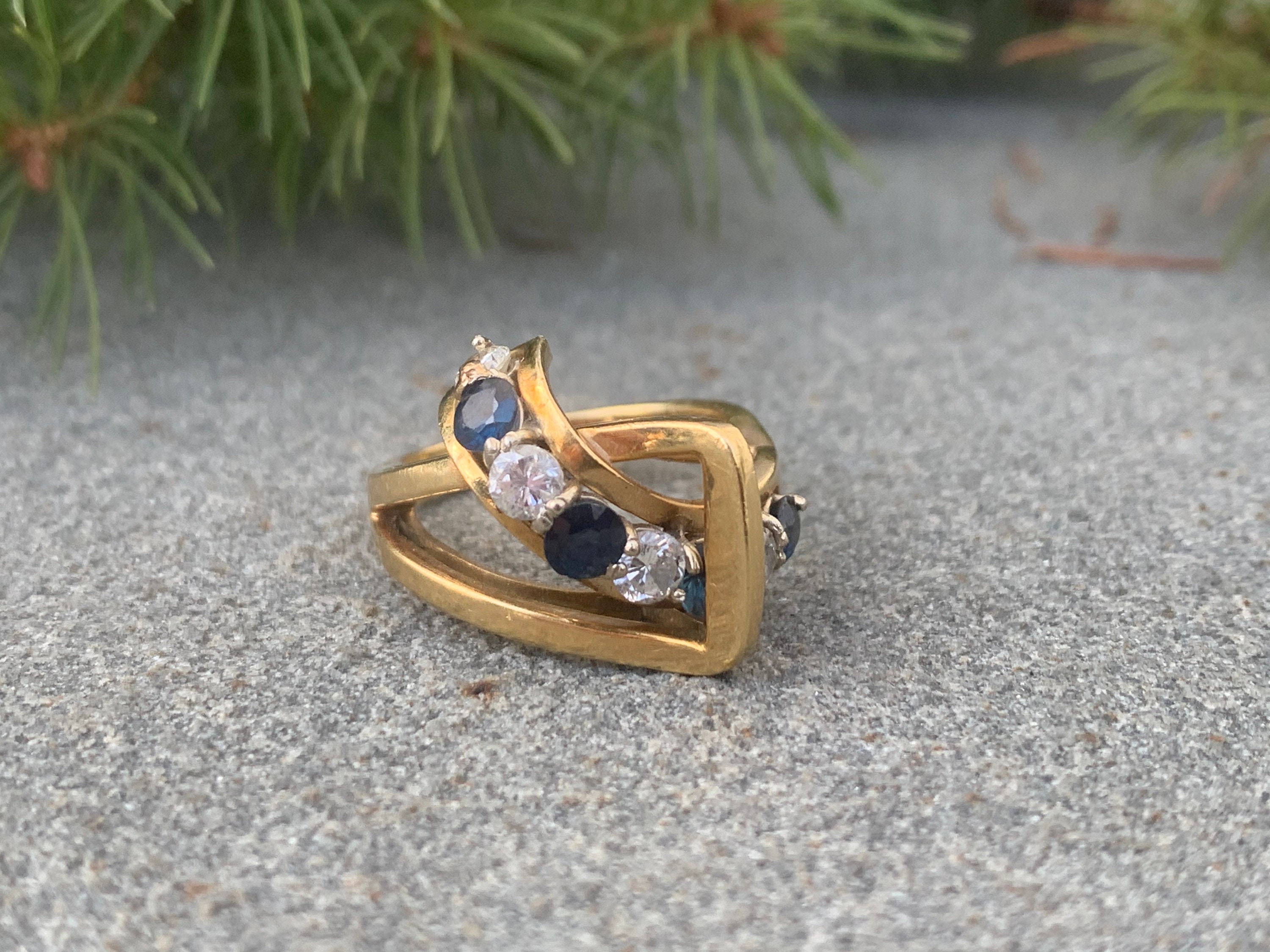 Set in 18k yellow gold, this abstract shaped diamond and sapphire cocktail ring has a spellbinding quality. It dates from the 1960’s. Within the geometric shaped like pieces of gold, sits .45 ct of round diamonds in a huddle of continual brilliance. The diamonds are H color and SI2 clarity. Alternating around the diamonds are .45 ct of cobalt blue sapphires capturing its pizzazz. A flood of fabulous on your finger. The ring weighs 8.49 grams. it is a size 6, but easily resizable at no extra cost.