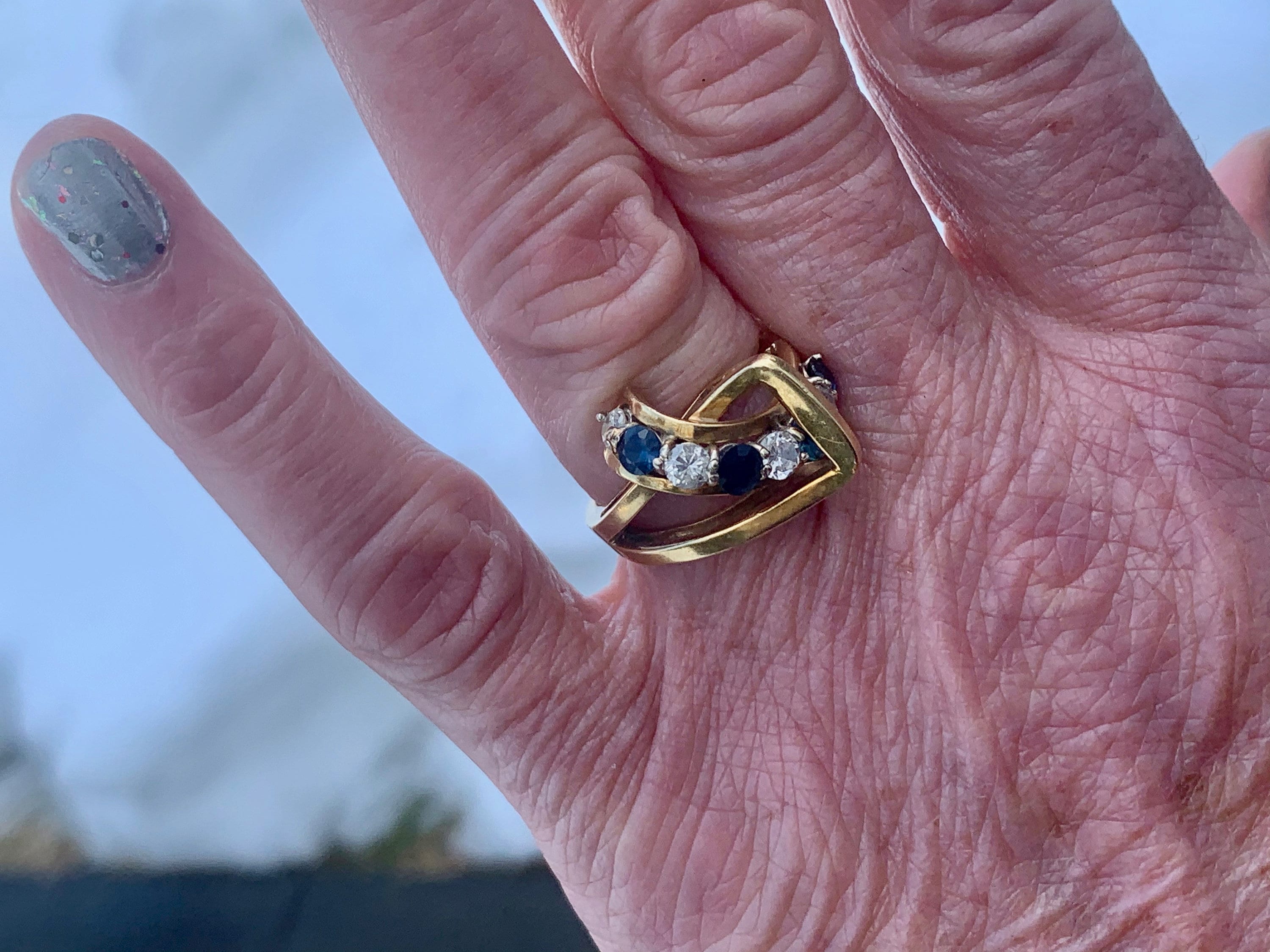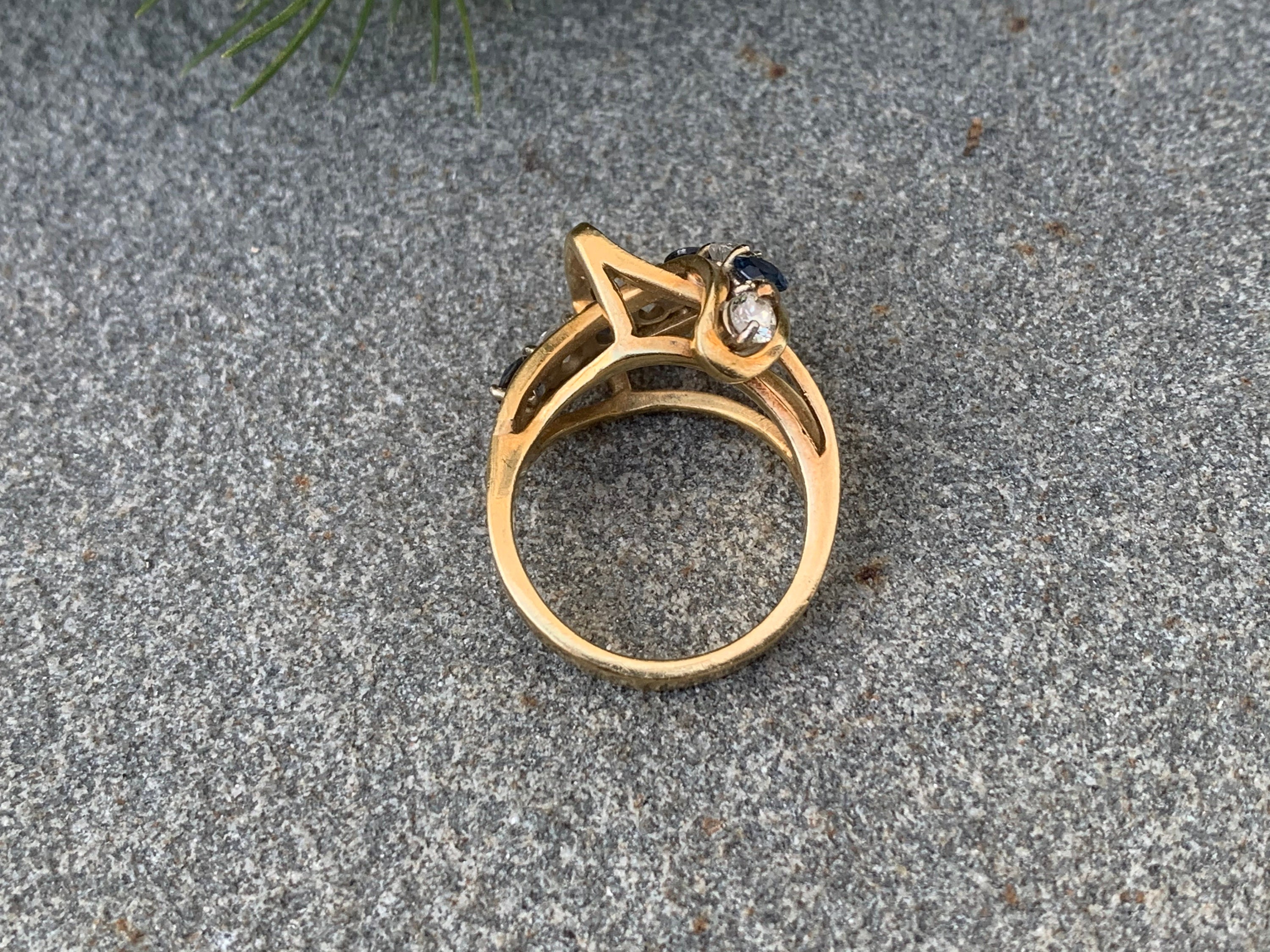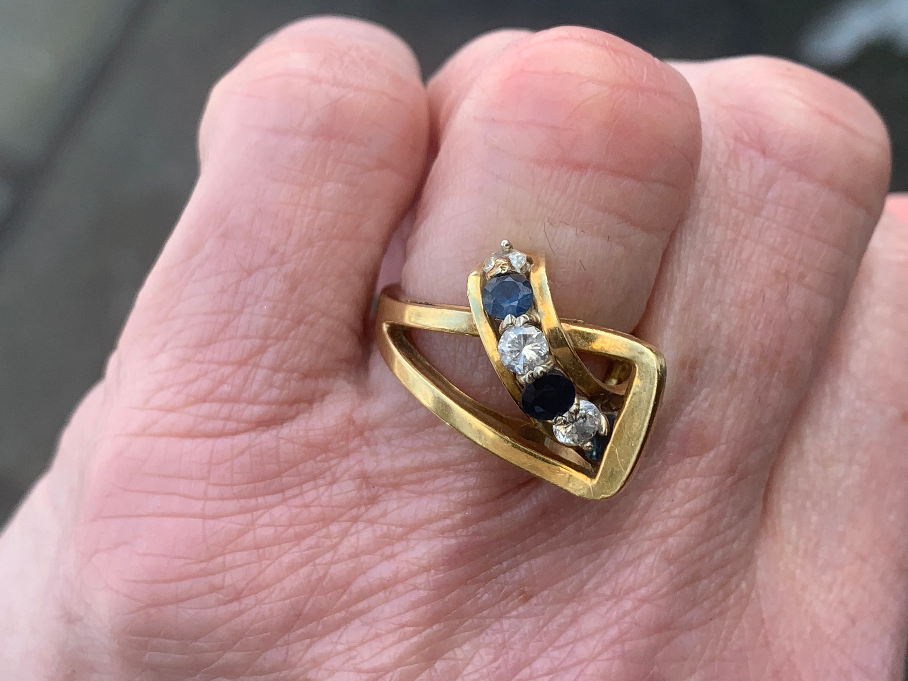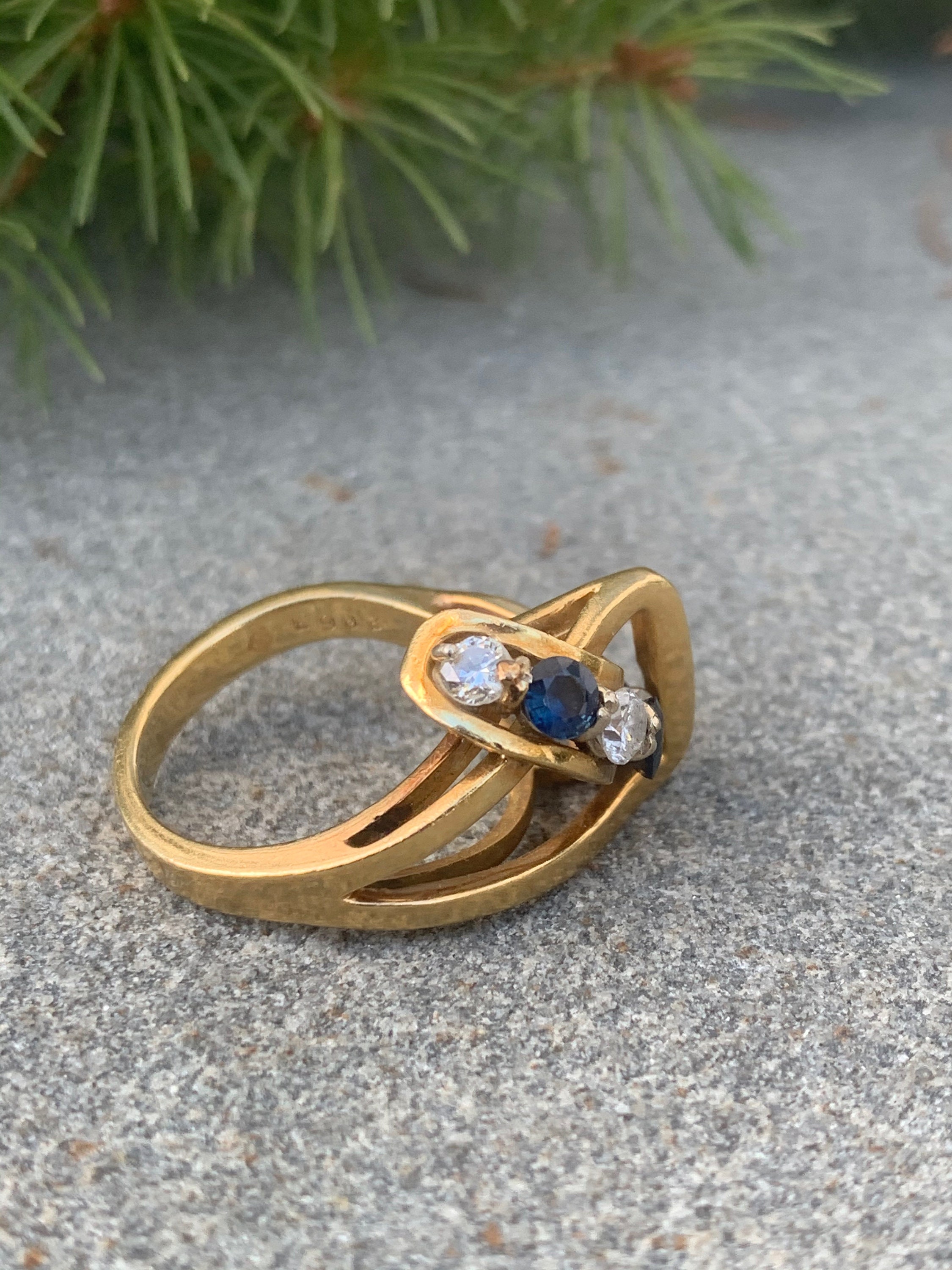 Set in 18k yellow gold, this abstract shaped diamond and sapphire cocktail ring has a spellbinding quality. It dates from the 1960’s. Within the geometric shaped like pieces of gold, sits .45 ct of round diamonds in a huddle of continual brilliance. The diamonds are H color and SI2 clarity. Alternating around the diamonds are .45 ct of cobalt blue sapphires capturing its pizzazz. A flood of fabulous on your finger. The ring weighs 8.49 grams. it is a size 6, but easily resizable at no extra cost.