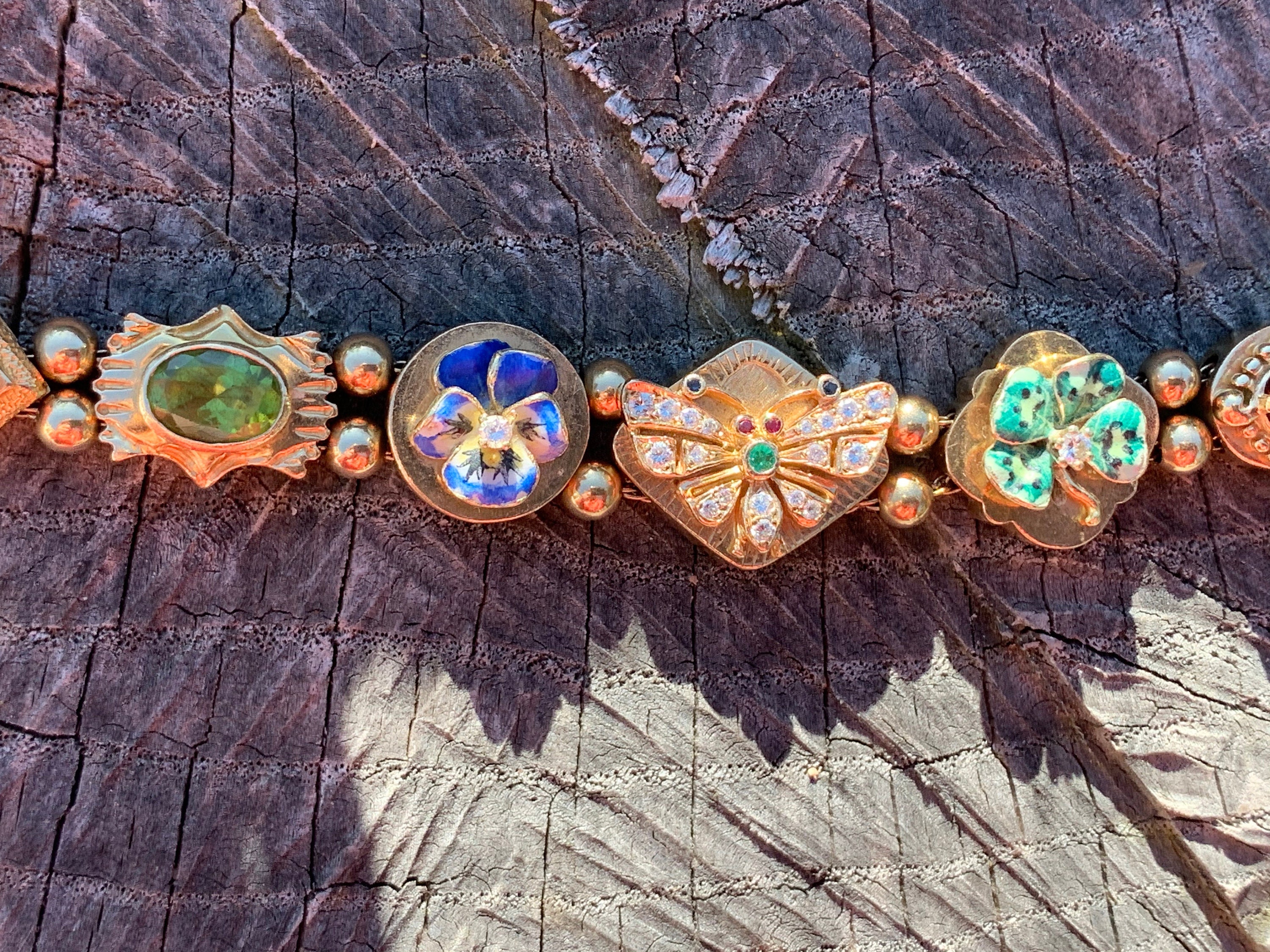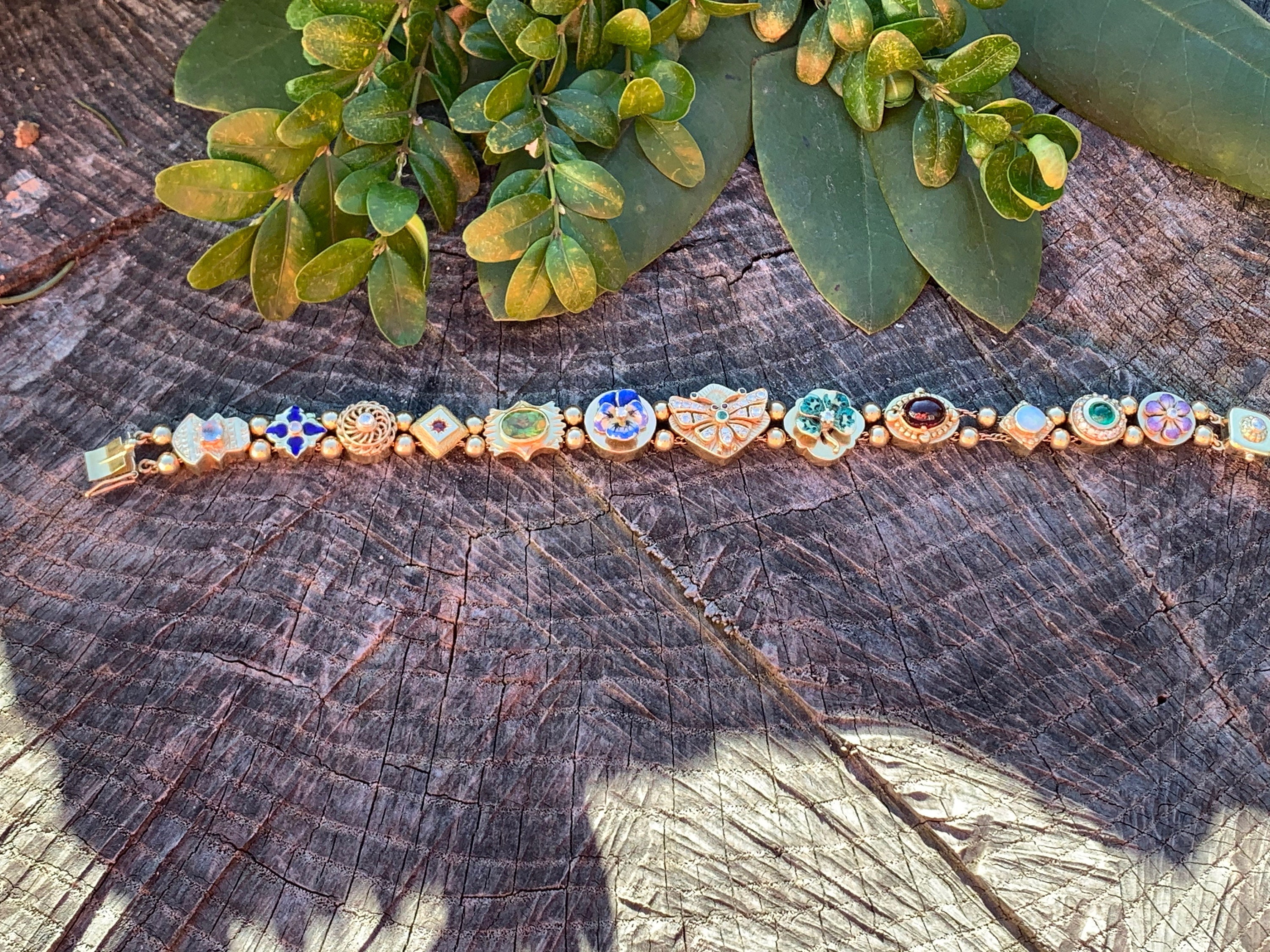 Set in 14k yellow gold, this enchanting multi stone slide bracelet dates from the 1950's. Each of the 13 charming slides are unique. They including green tourmaline, blue topaz, enamel, garnet, pearl, opal and diamonds, creating a story of its own. It comes together for an energetic look draped in magnificence. Slides include a butterfly and gorgeous enamel painted flowers among other beauties. The bracelet measures 7 1/2” long. It measures 1/2" wide. The bracelet weighs 39.56 grams.